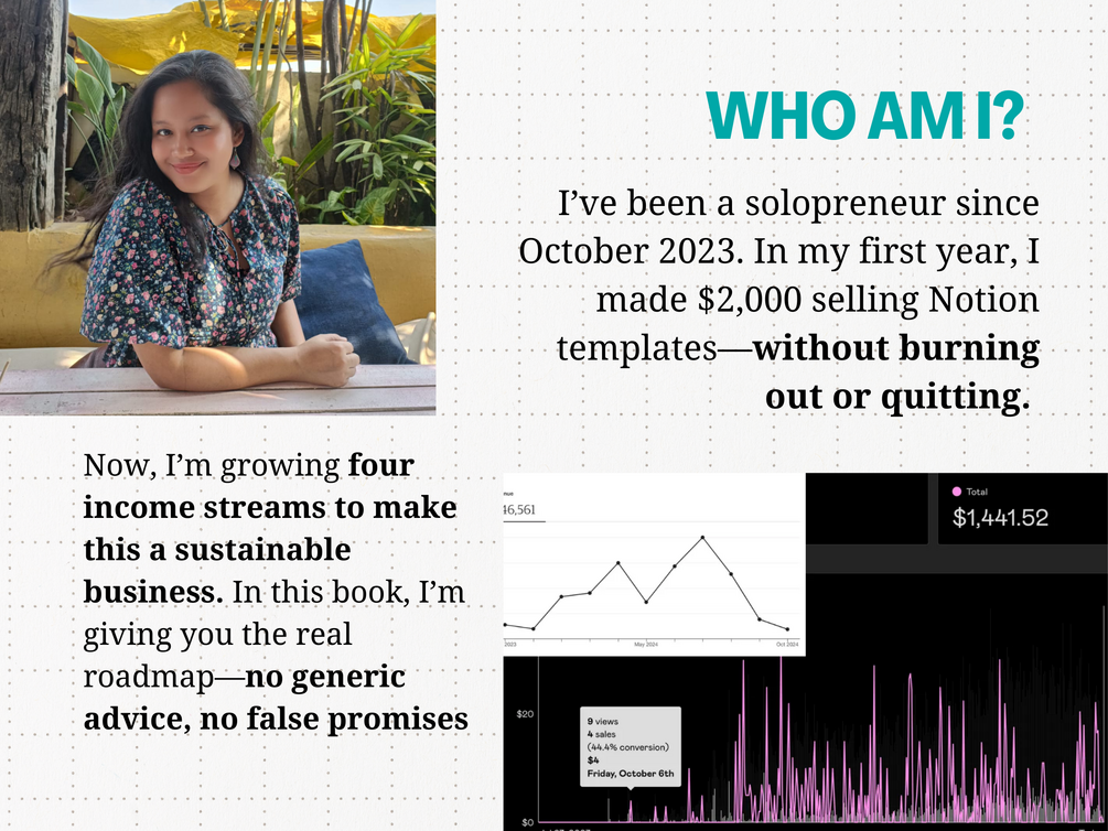 I’ve been a solopreneur since October 2023. In my first year, I made $2,000 selling Notion templates—without burning out or quitting. Now, I’m growing four income streams to make this a sustainable business. And in this book, I’m giving you the real roadmap—no generic advice, no false promises.