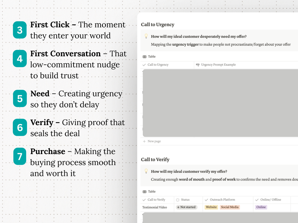 This Notion planner breaks down the vague idea of “call-to-action” into 9 powerful, strategic steps that guide your audience from discovery to recommendation.