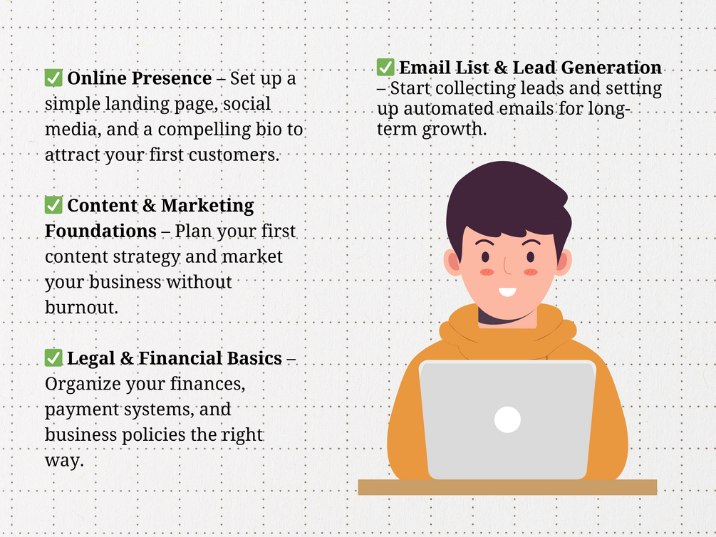 ✅ Online Presence – Set up a simple landing page, social media, and a compelling bio to attract your first customers.