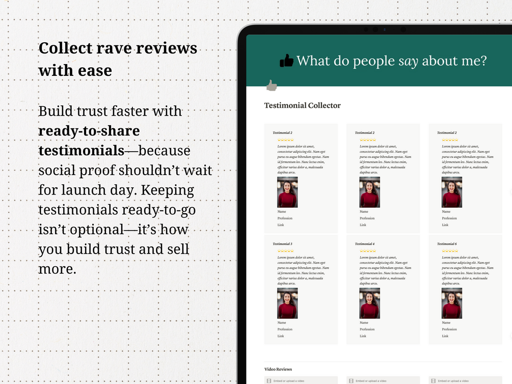 Collect rave reviews with ease. Whether it’s text, videos, or screenshots—store it all in one clean, customizable Notion template. Because keeping testimonials ready-to-go isn’t optional—it’s how you build trust and sell more. Start collecting today and show off that social proof like a pro.